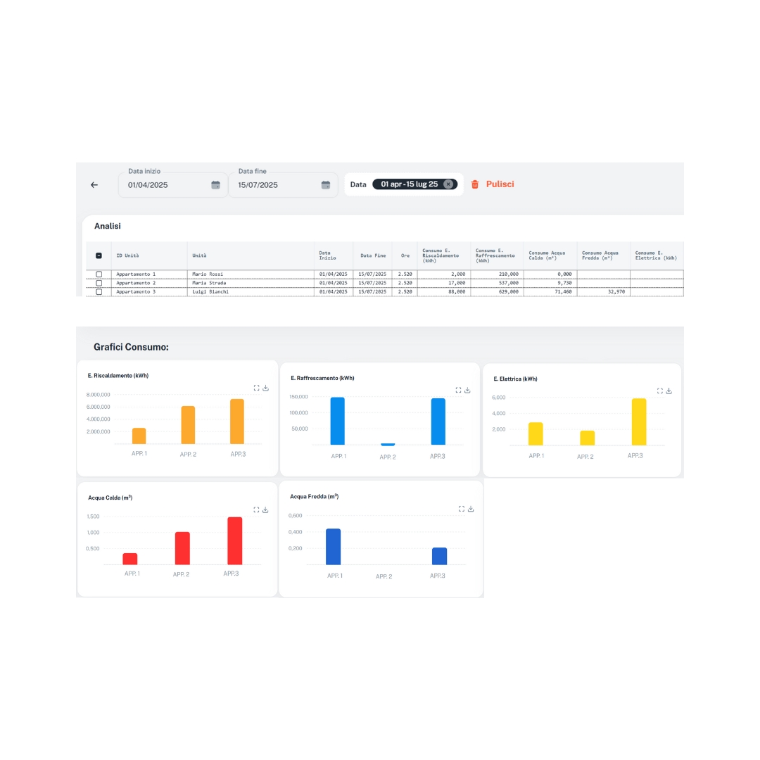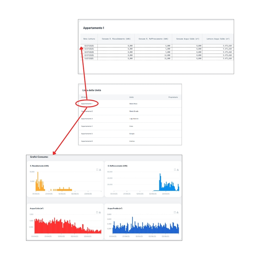 L’ultimo tassello del sistema è la Ripartizione dei Costi: combinando i dati acquisti da WiMeter con le tabelle millesimali dell’edificio ed i costi da ripartire in un opportuno modello di calcolo, si arriva a generare le singole «bollette» per i condomini.